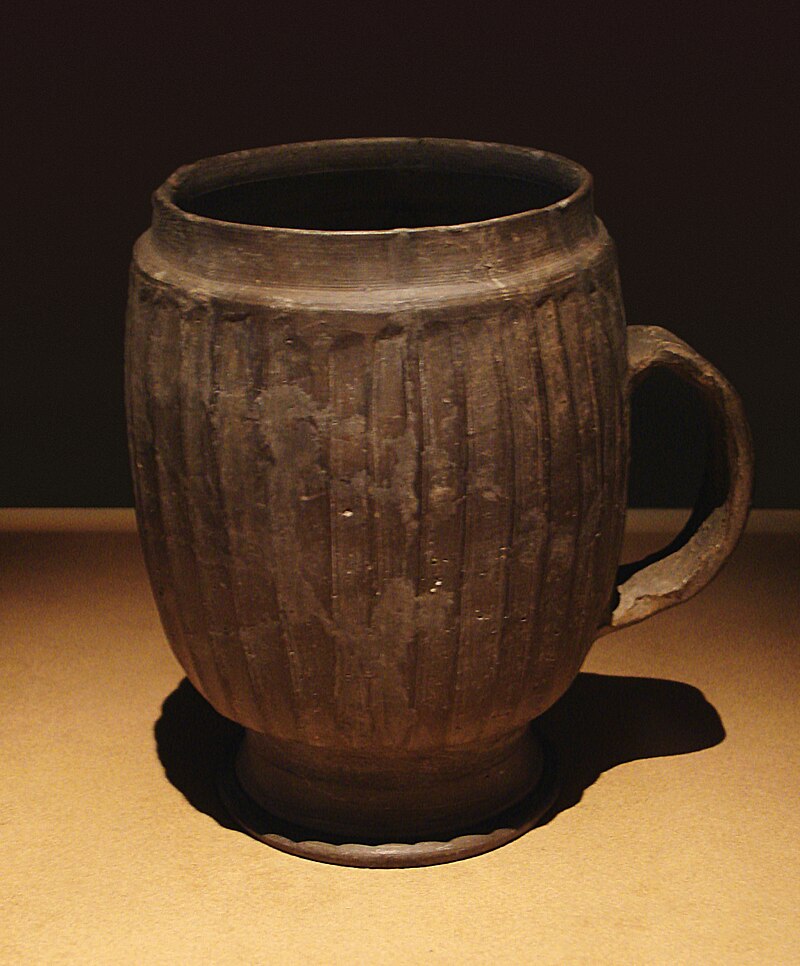 As versões “menos primitivas” eram feitas de cerâmica (6.500 a.C), ou seja, usavam argila moldada à mão e eram queimadas em fornos. A função era simples: armazenar líquidos para consumo. Com a invenção da roda de oleiro (cerca de 3.500 a.C), sua fabricação foi facilitada. No entanto, ainda havia uma desvantagem: as canecas eram grossas e desajeitadas, o que dificultava seu uso (impróprias para a boca).